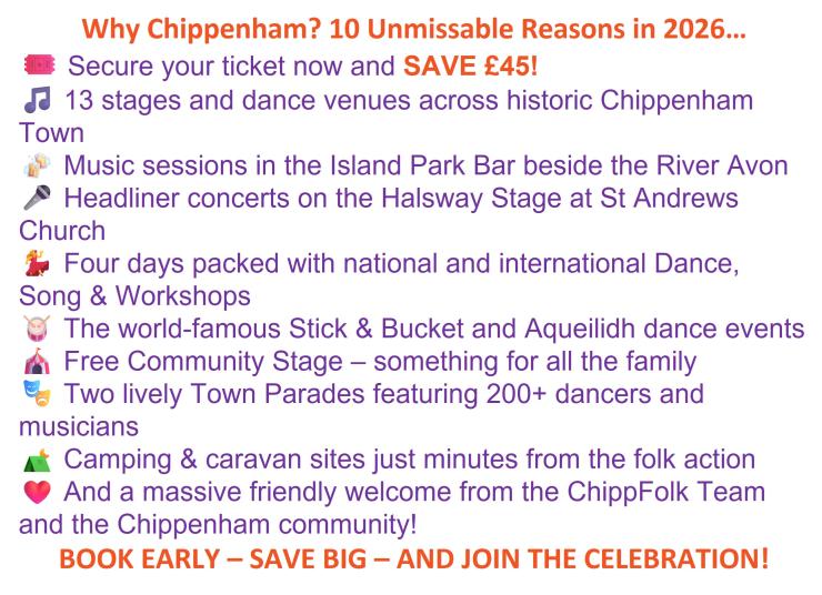 Grab your Early Bird ticket, save £45 and come and enjoy the unique Chippenham folk experience!